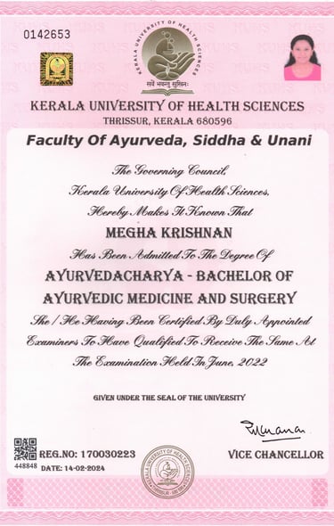 Ich bin qualifizierte Ayurveda-Praktikerin aus Kerala, Indien, dem Ursprungsland des Ayurveda. Mein 5,5-jähriges Studium der Ayurvedischen Medizin (BAMS) bildet die Grundlage meiner Arbeit.