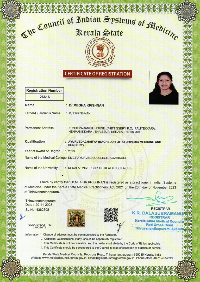 Registriert beim Council of Indian Systems of Medicine, Kerala.